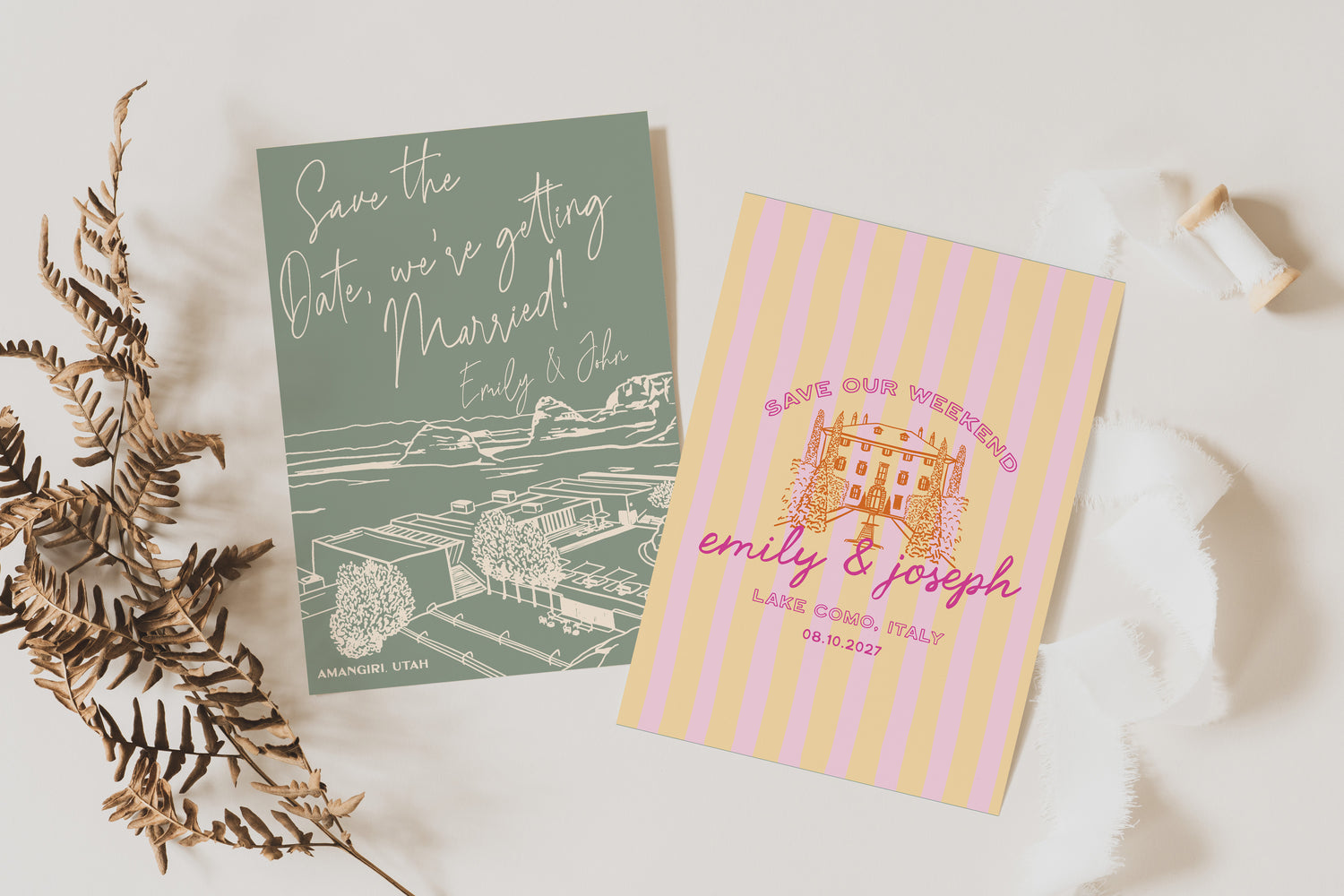 I offer full-service wedding stationery design, including save the dates, invitation suites, and day-of paper goods like menus, place cards, and signage.